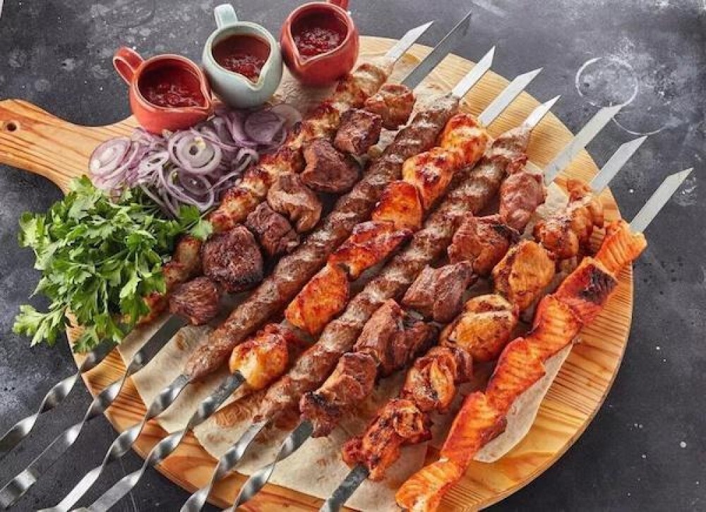 - Шашлык из филе грудки - 1 порция - Шашлык из куриных крылышек - 1 порция - Шашлык из свиной шеи - 1 порция - Шашлык из карбоната свинины - 1 порция - Шашлык из баранины мякоть - 1 порция - Люля-кебаб куриный - 1 порция - Картофель на мангале 300г.